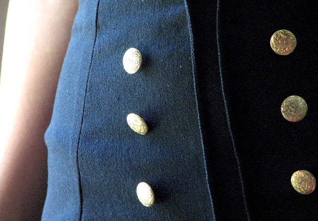 Scurtă din nou, din denim închis la culoare, cu nasturi aurii metalici.